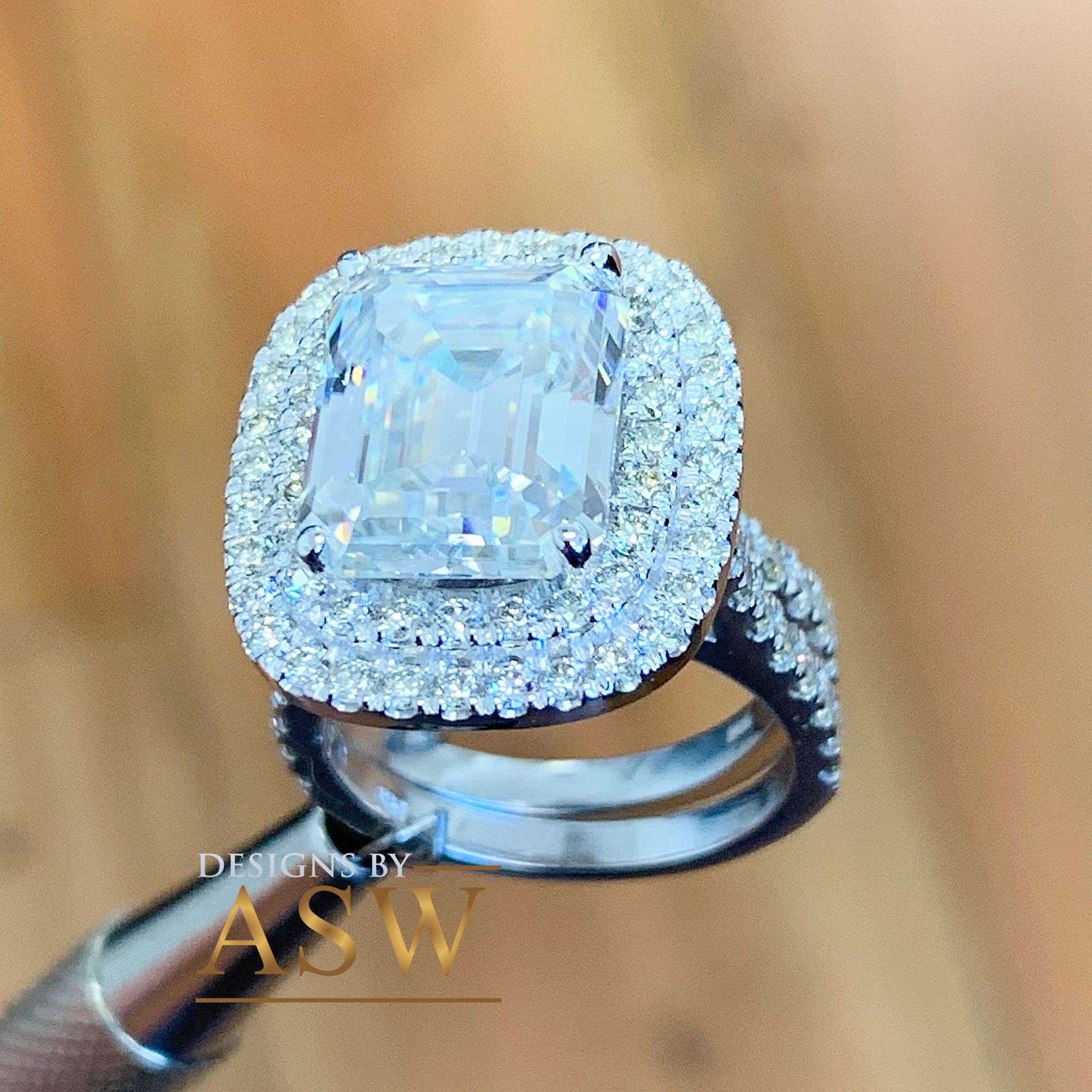 This beautiful Large ring and bands design is a beautiful creation showcasing the center emerald cut in a halo surrounded with beautiful and sparkly diamonds and two perfect matching bands with same size diamonds and design as the sides of the main ring.