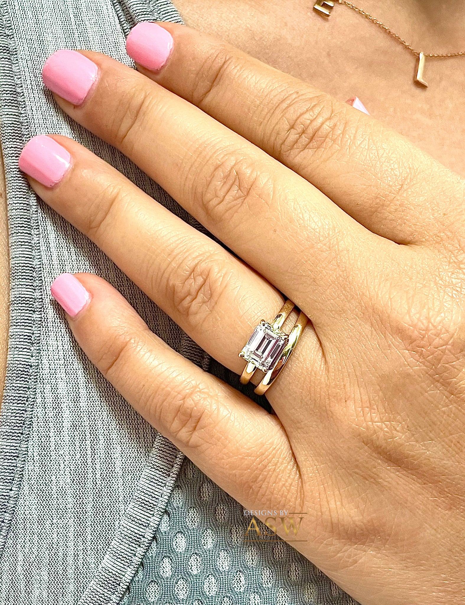 A beautiful creation showcasing a perfectly cut 1.50ct center emerald cut in prong set showing mostly the diamond to maximize shine and luster, and a beautiful matching band