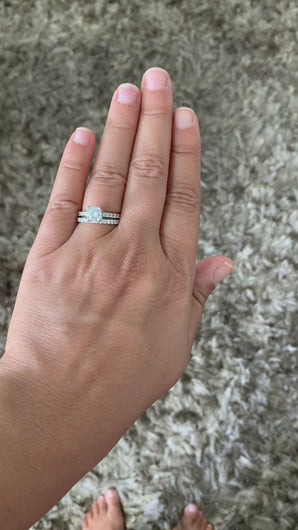 This beautiful minimalist ring and band design is a beautiful creation showcasing the center cushion brilliant cut in a halo surrounded with beautiful and sparkly diamonds and perfect matching band with same size diamonds and design as the sides of the main ring.