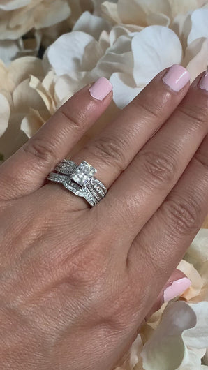 This beautiful and elegant ring and band design is a beautiful creation showcasing a center radiant cut with beautiful and sparkly triangle cut diamonds on the sides.