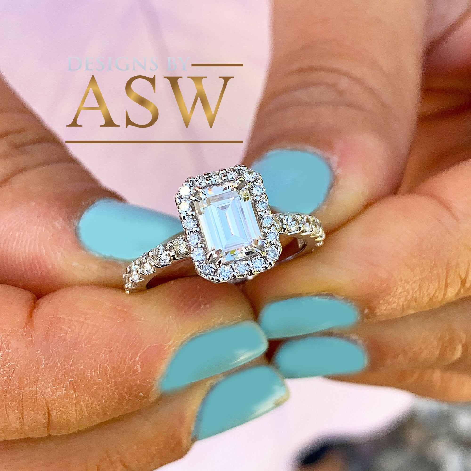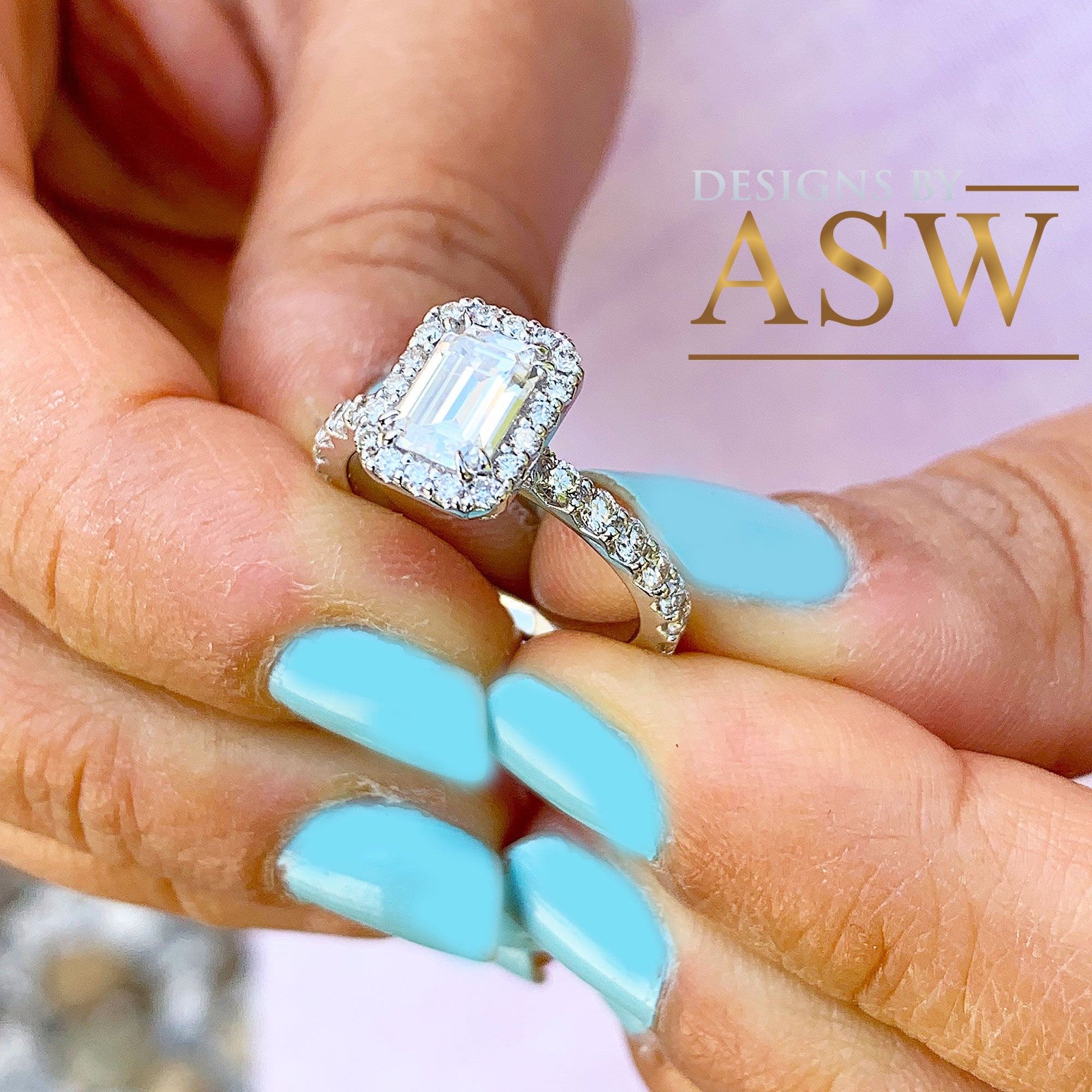 14k white gold, 2.70ctw emerald and round cut simulated diamonds, art-deco prong set styel engagement ring