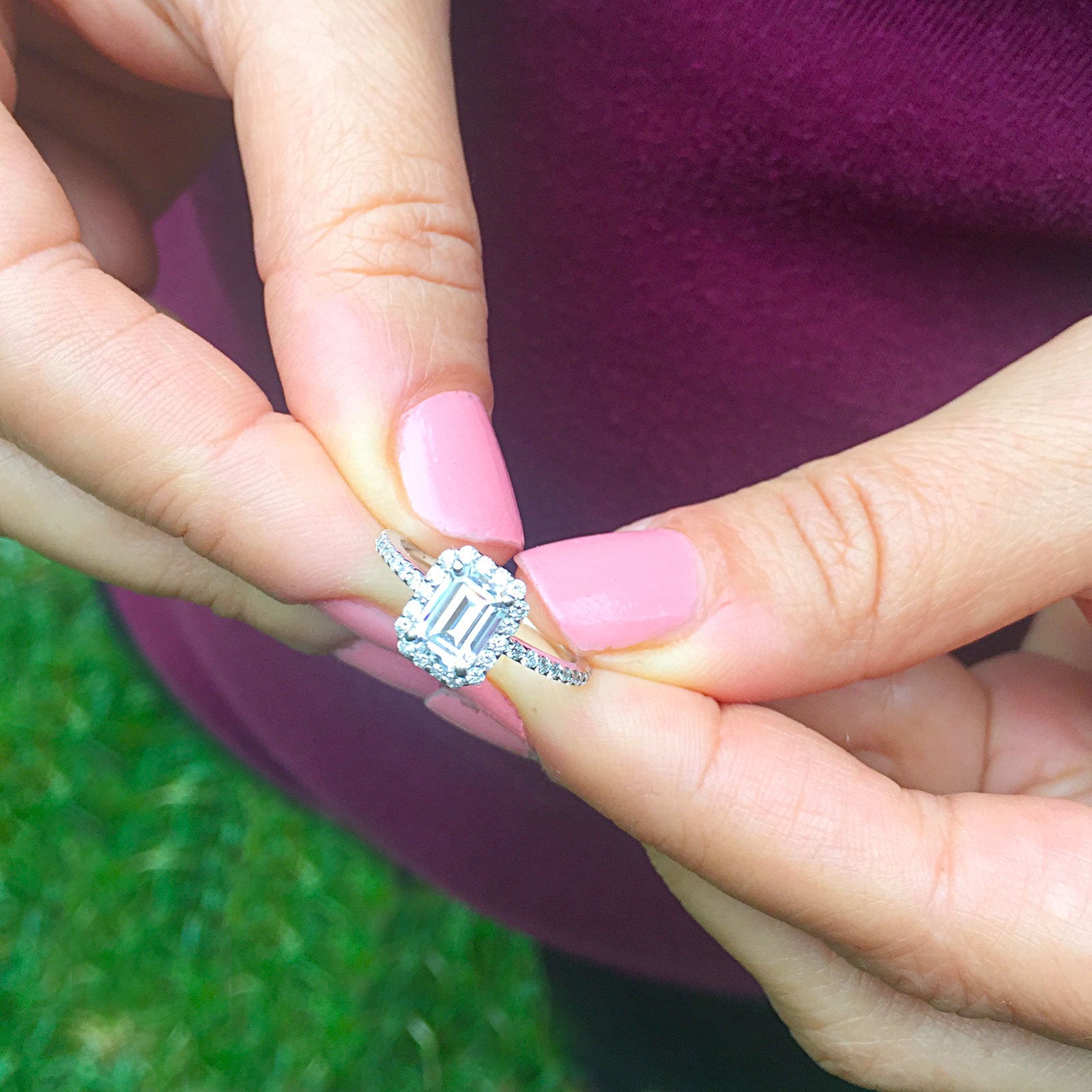 14k white gold, 2.00ctw emerald and round cut simulated diamonds, art-deco prong set styel engagement ring