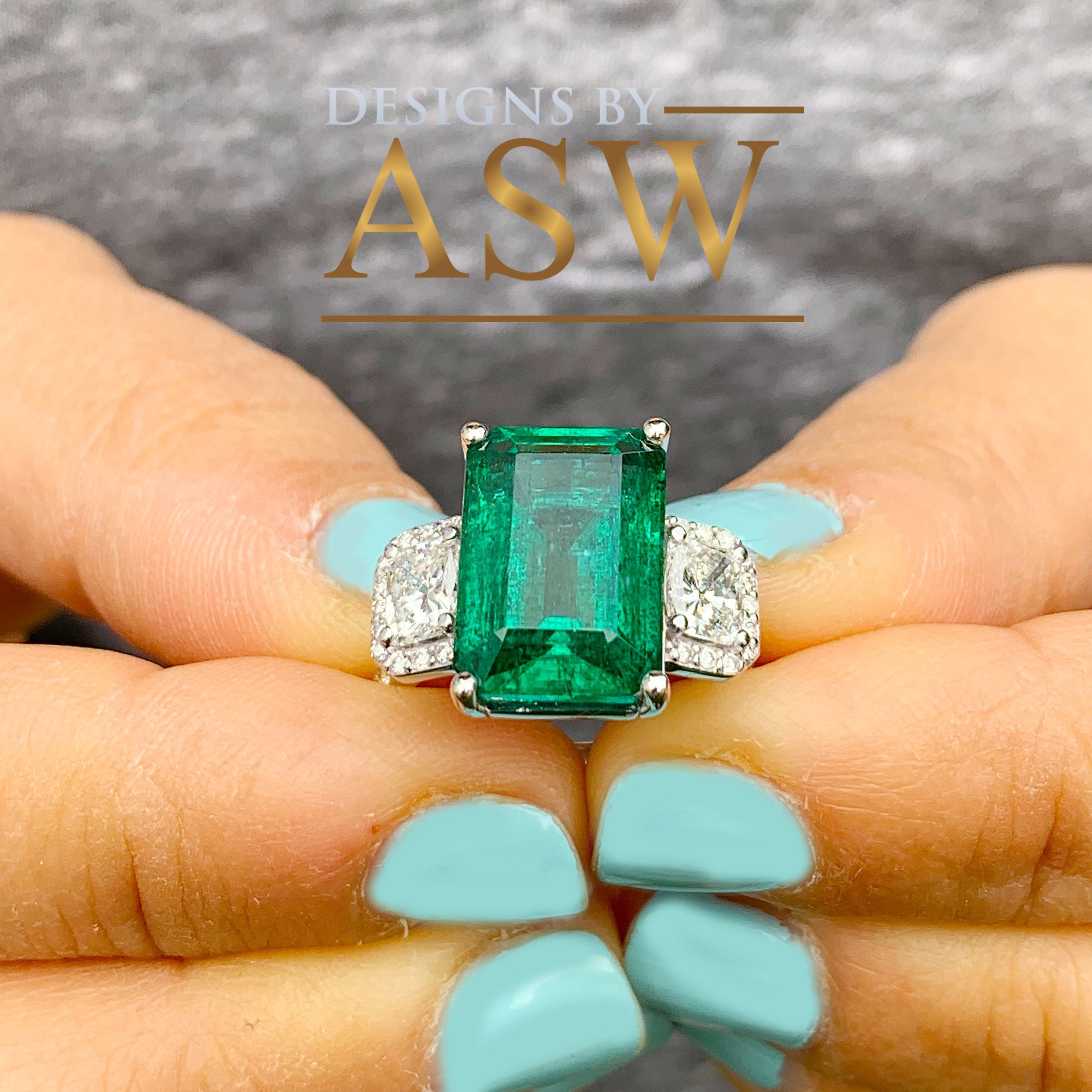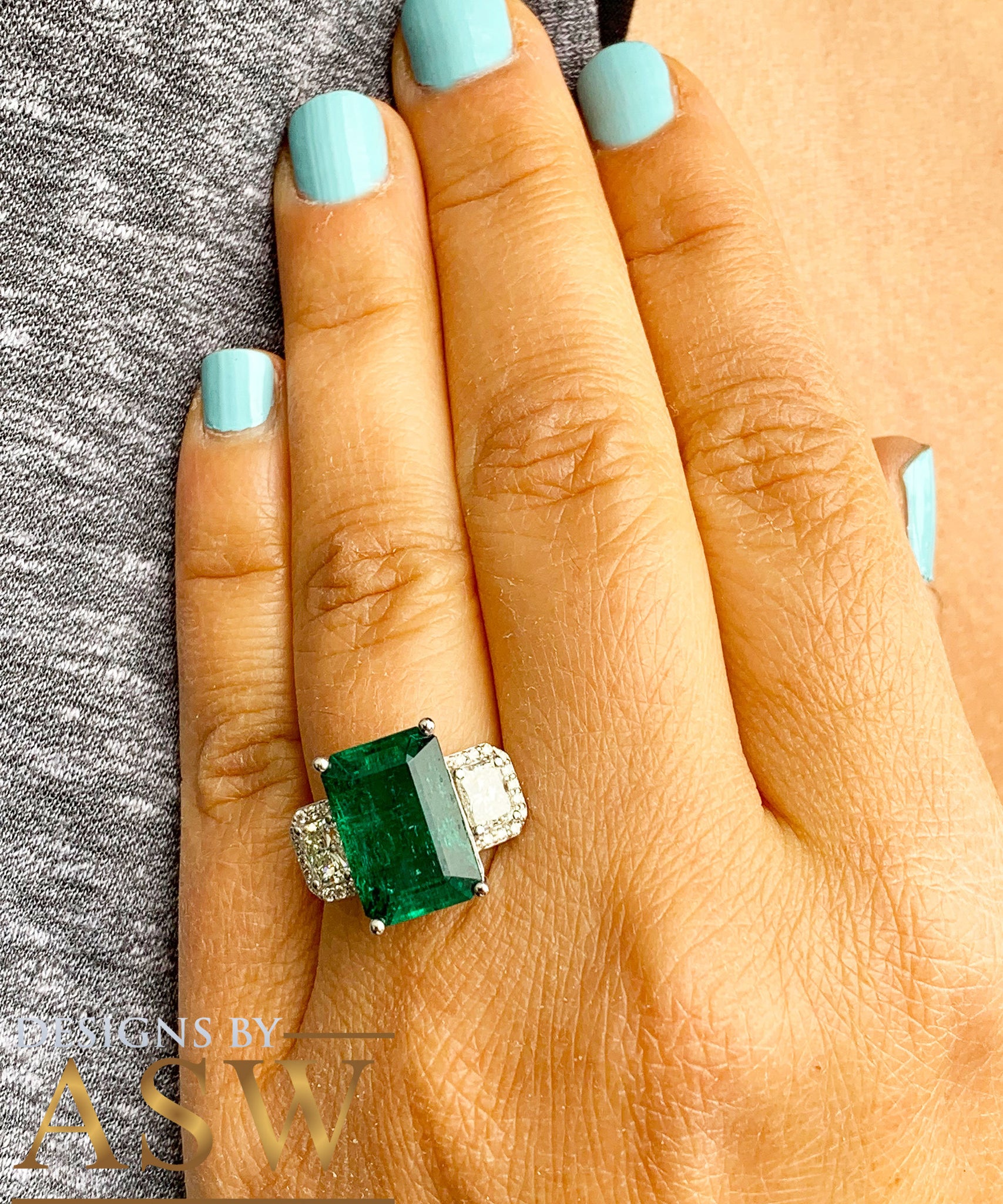 A gorgeous design with a stunning emerald cut emerald (true natural emerald color) set in a beautiful design, this ring definitely catches the eye!