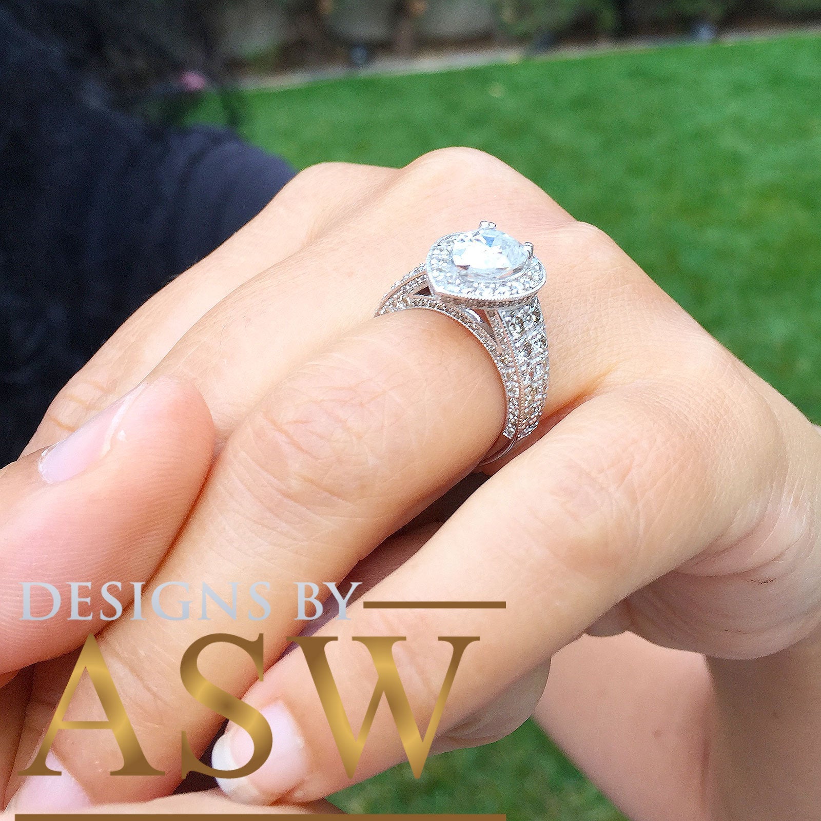 This is a beautiful design solid 14k white gold, 4.20ctw pear and round cut simulated diamonds, art-deco / prong & pave set style engagement ring