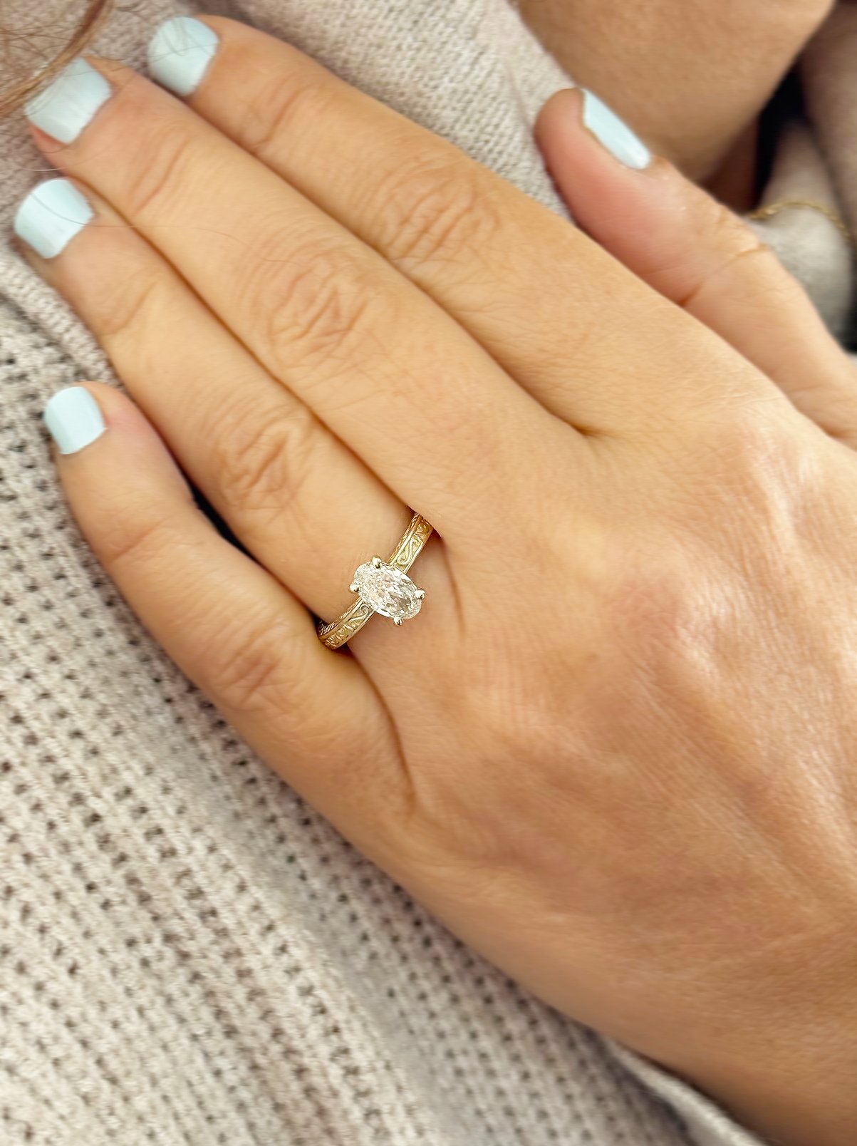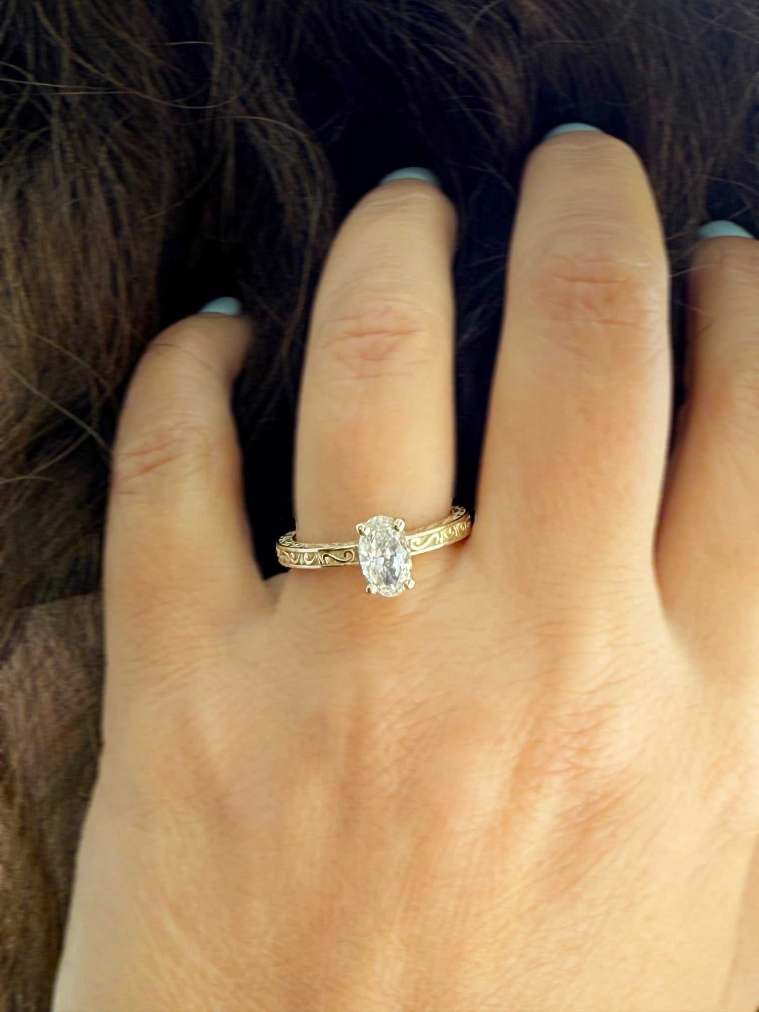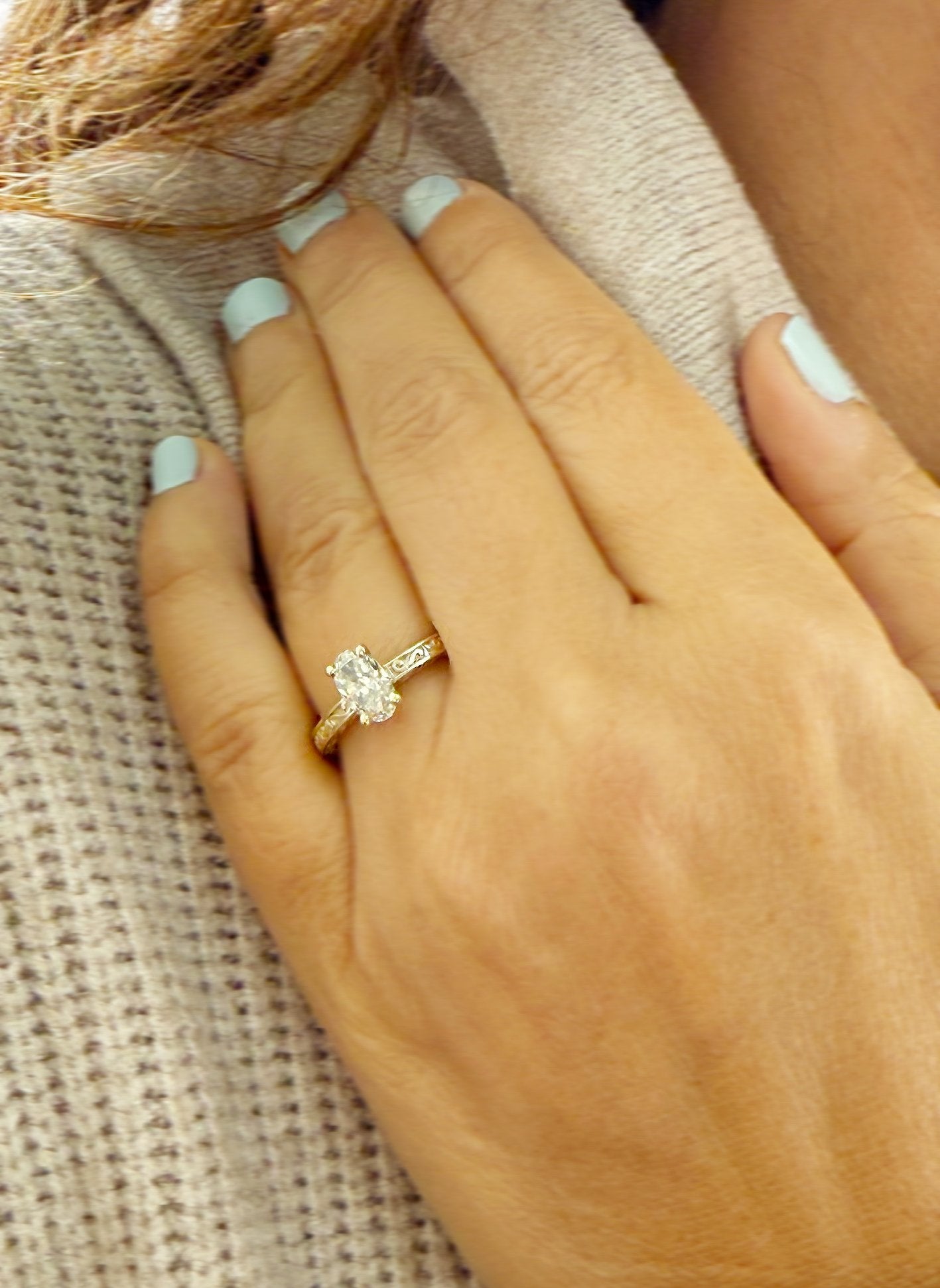 This Oval Shape Simulated Diamond Solitaire Engagement Ring brings together vintage elegance and timeless craftsmanship. Set in 14k solid yellow gold, the 1.00ctw oval center stone delivers exceptional brilliance, creating a refined and luxurious focal point. Its elongated shape adds a graceful and flattering look on the hand.