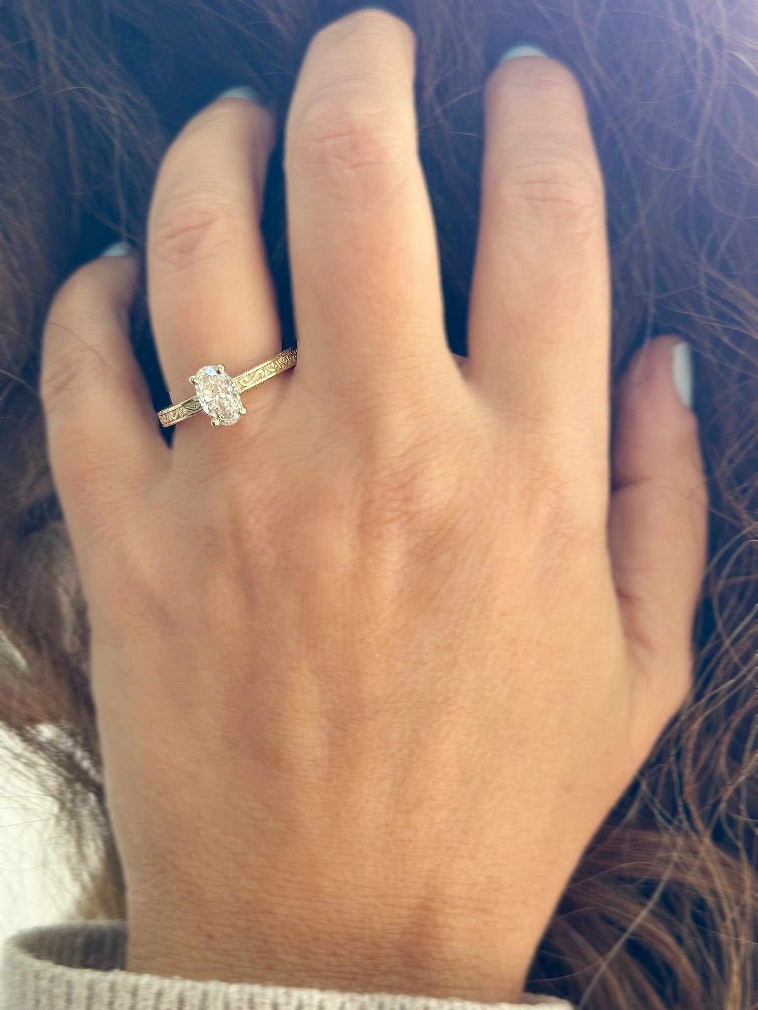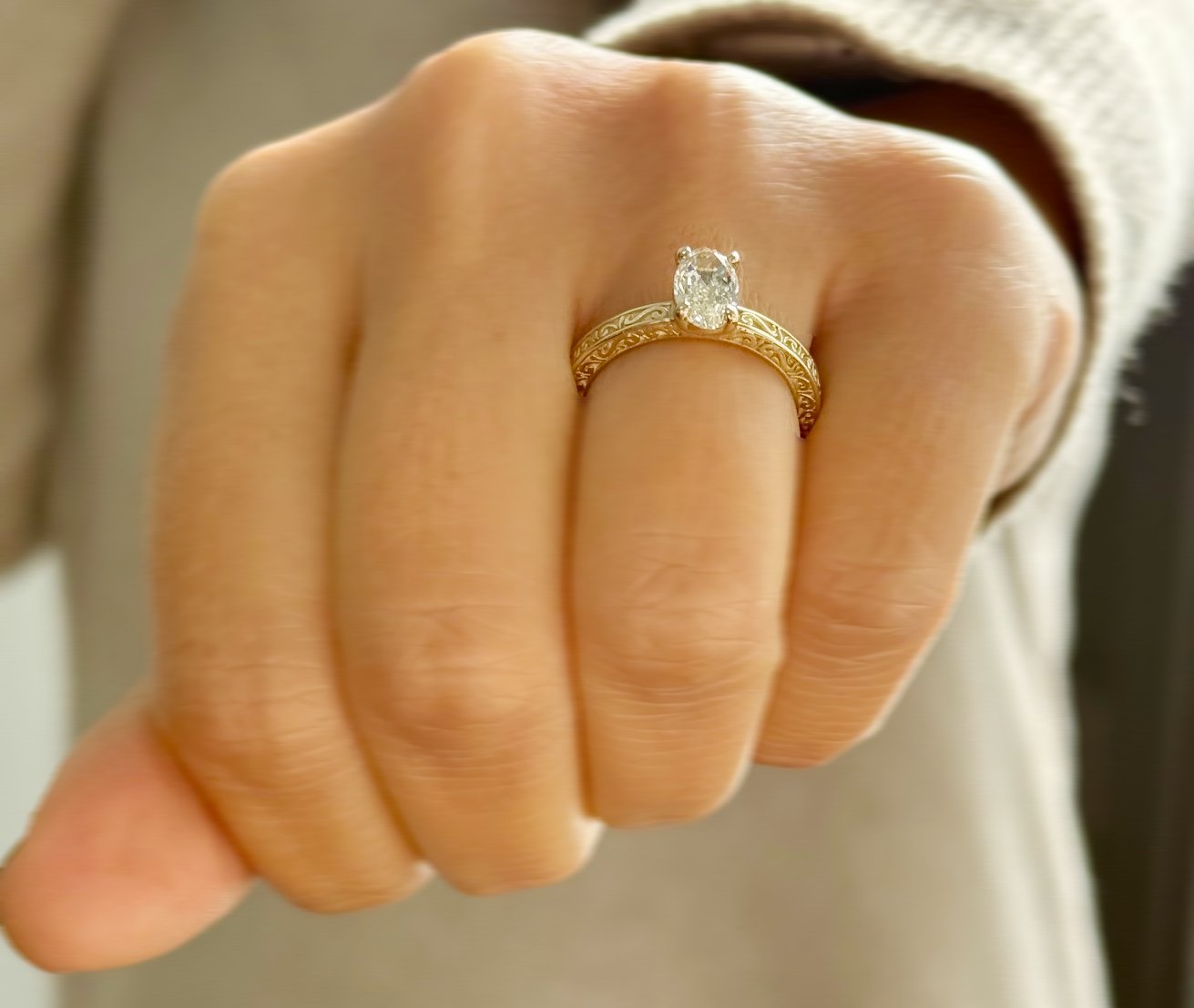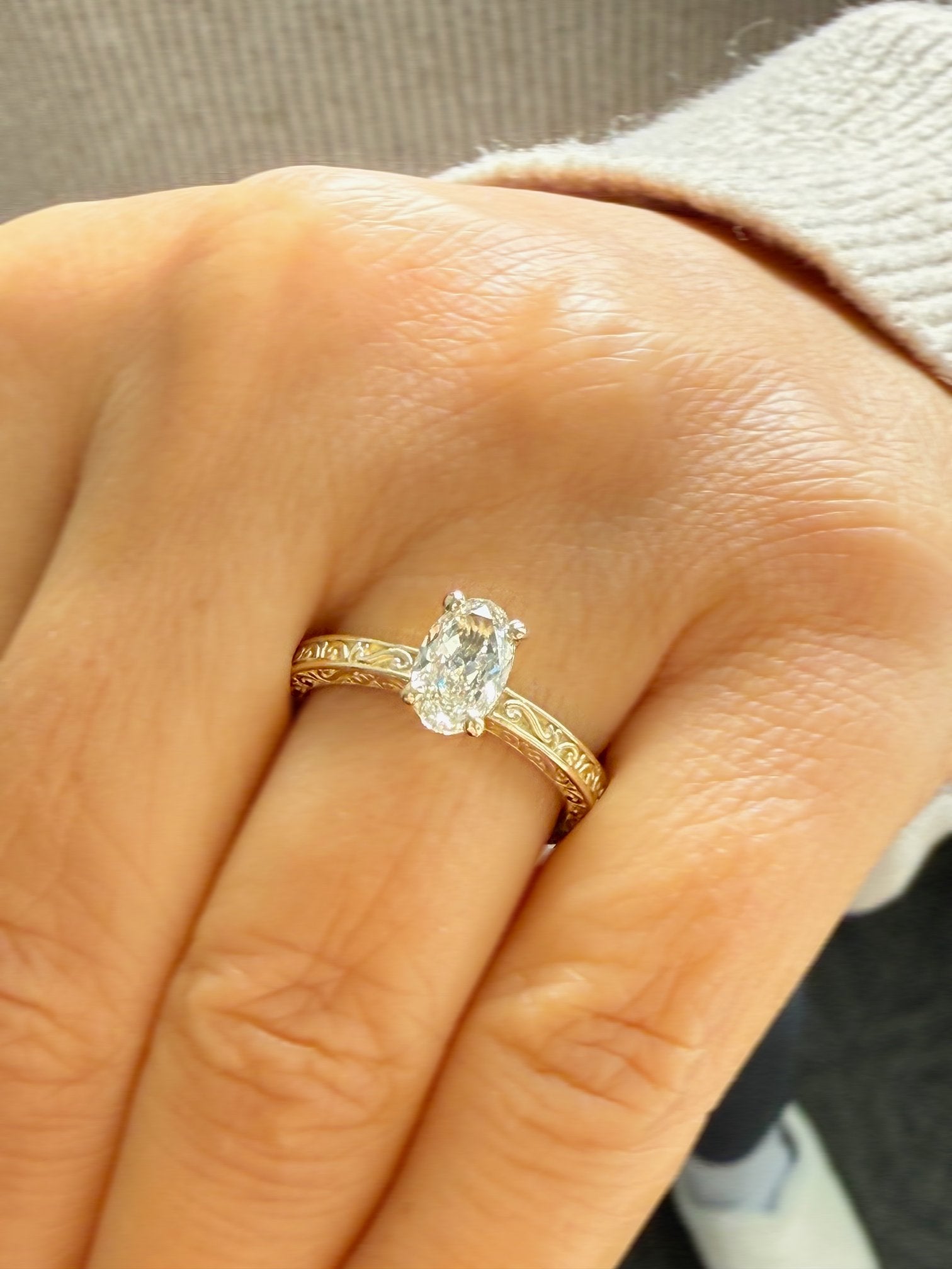 This Oval Shape Simulated Diamond Solitaire Engagement Ring brings together vintage elegance and timeless craftsmanship. Set in 14k solid yellow gold, the 1.00ctw oval center stone delivers exceptional brilliance, creating a refined and luxurious focal point. Its elongated shape adds a graceful and flattering look on the hand.