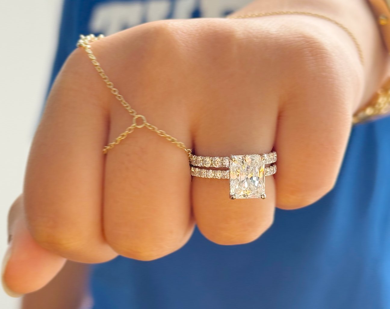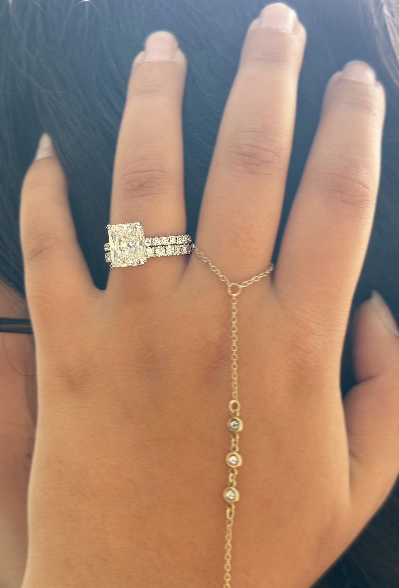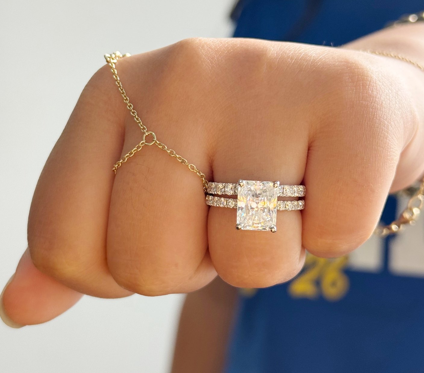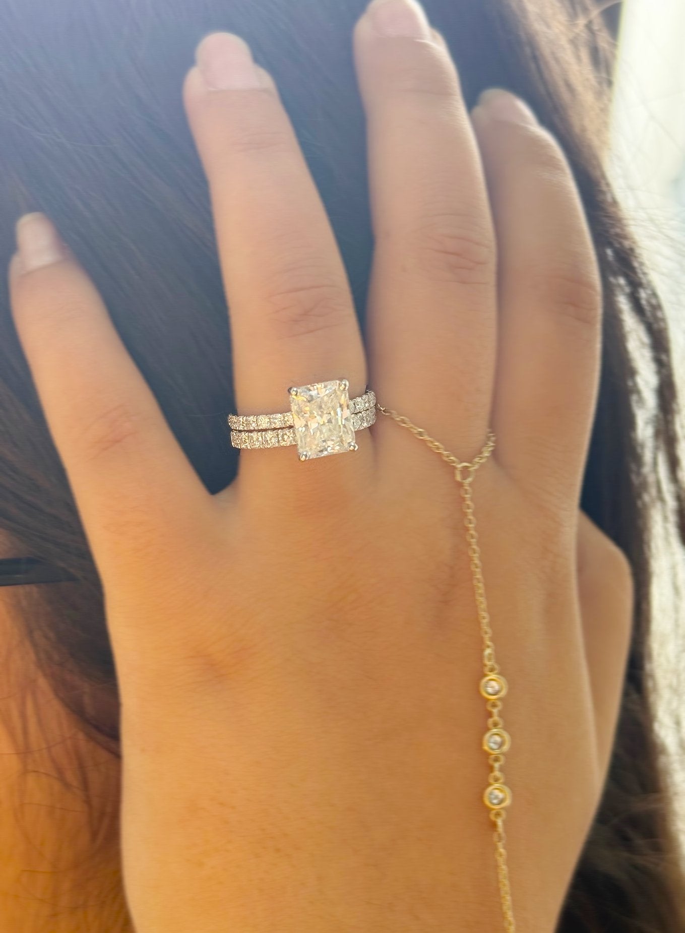 Perfect for engagements, anniversaries, or as a meaningful gift, this solitaire radiant-cut bridal set symbolizes strength, love, and commitment. Its classic yet contemporary design makes it a cherished piece that will stand the test of time. Whether you're proposing or celebrating a lifelong partnership, this set is a stunning declaration of love and devotion