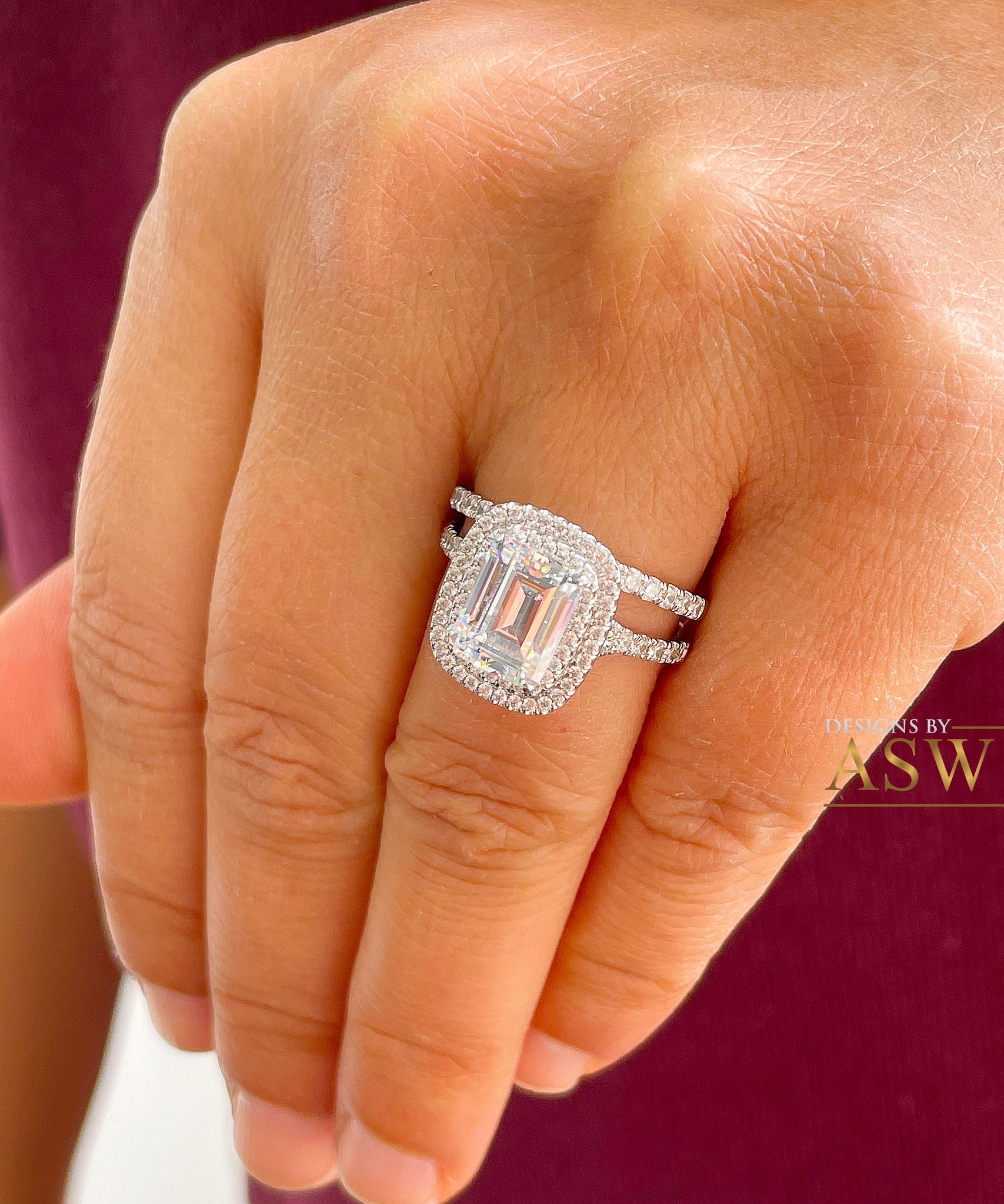 A beautiful creation showcasing a perfectly cut 2.00ct center emerald cut halo surrounded with beautiful and sparkly round cut diamonds in prong set double halo showing mostly the diamonds to maximize shine and luster, and a beautiful matching band with same size diamonds and style!