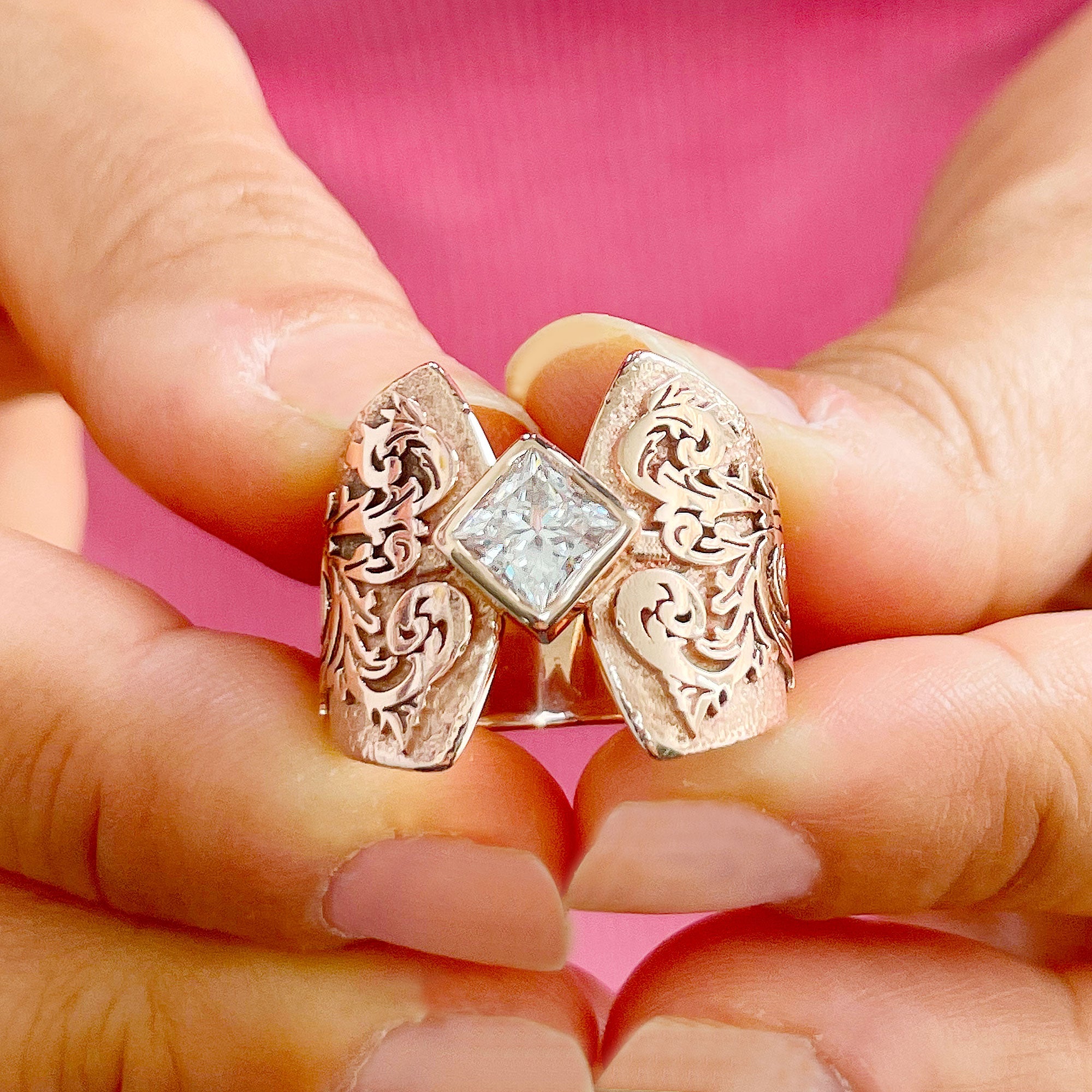 An elegant design with filigree work all around, a beautiful creation showcasing a perfectly cut 1.20ct center princess cut halo surrounded with beautiful and sparkly round and baguettes cut diamonds!