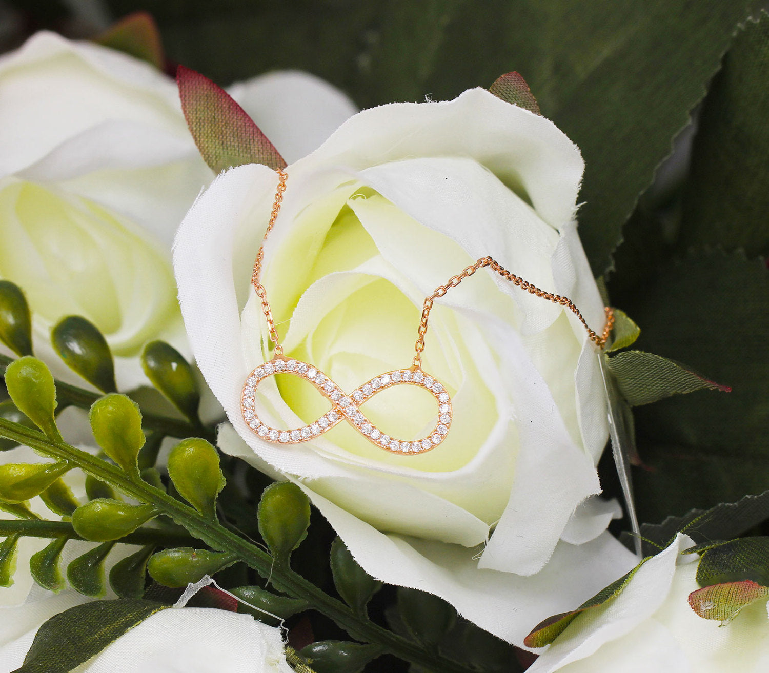 This is a beautiful infinity style design solid rose gold 0.50ctw round cut simulated diamonds art-deco / pave set style Necklace pendent. Also included 16" chain adjustable up to 18".