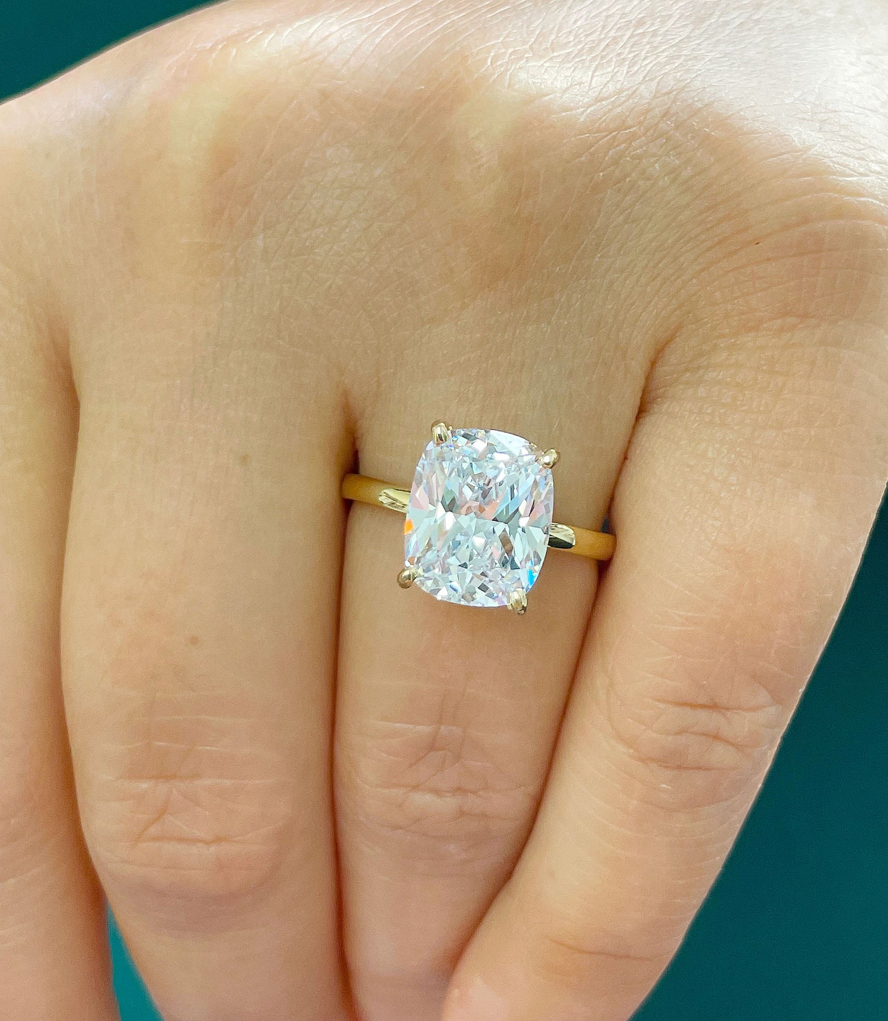 Women's Large Four Carat 14k Yellow Gold Cushion Simulated Diamond Engagement Ring, Bridal, Wedding, Anniversary, Prongs, Solitaire Propose