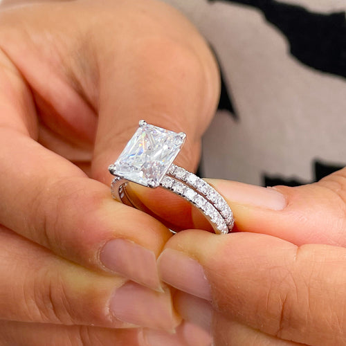 Women's Large 5.70ctw 14k Solid White Gold Radiant Simulated Diamond Engagement Ring And Band Set