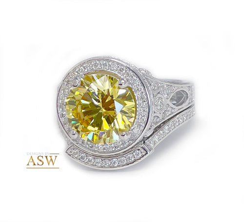 14K Solid White Gold Fancy Yellow Round Cut Simulated Diamonds Engagement Ring And Band Set Halo Wedding Bridal Set 4.25ctw