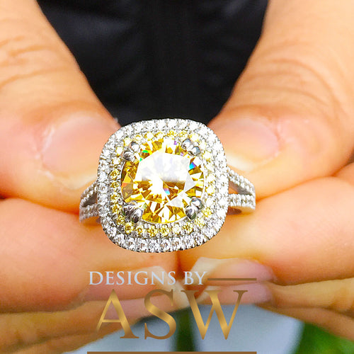 Large 4.00 Carats 14k Solid White Gold Round Cut Simulated Diamond and simulated Fancy Yellow Diamonds Engagement Ring Double Halo
