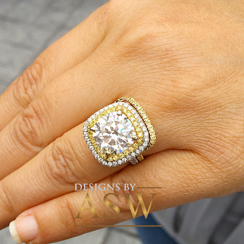 Huge 7.10 Carats 14k Solid White and Yellow Gold Cushion and Round Cut Simulated Diamond Engagement Ring And Two Band Double Halo