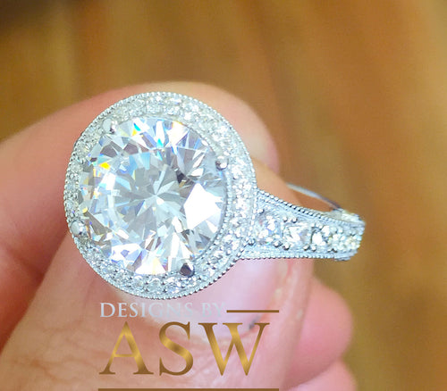 LARGE 14k Solid White Gold Round Cut Simulated Diamond Engagement Ring Bezel Bridal Wedding Halo 4.50ctw Propose Promise Legacy by ASW