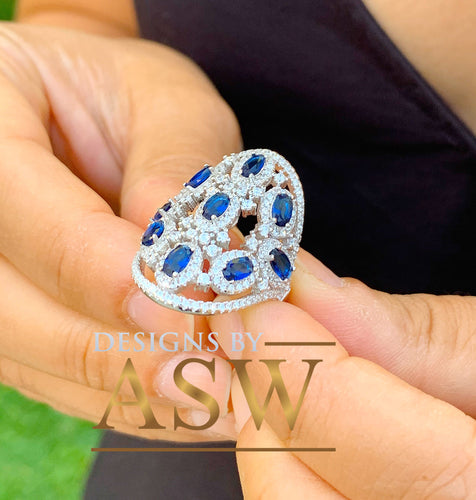 Large Style Ring, Anniversary, Wedding, White Gold Rhodium Solid Sterling Silver .925 and 5.00ctw Simulated Diamonds and Sapphires