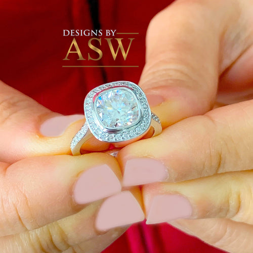 LARGE 14k Solid White Gold Cushion And Round Cut Simulated Diamond Engagement Ring Bezel Bridal Wedding Halo 3.00ctw Propose Promise Legacy