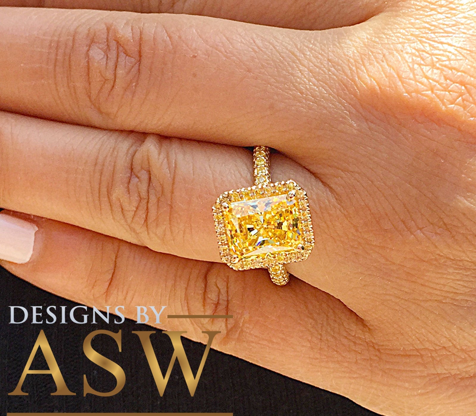 14K Solid Yellow Gold Radiant Cut Yellow Citrine Simulated Diamond Engagement Ring Prong Set lots of shine and luster round cut sides 4.75ct